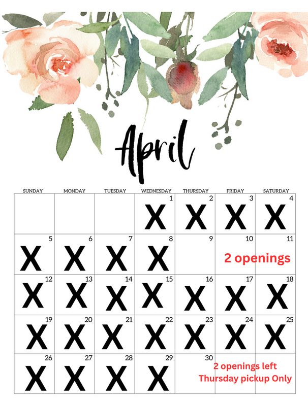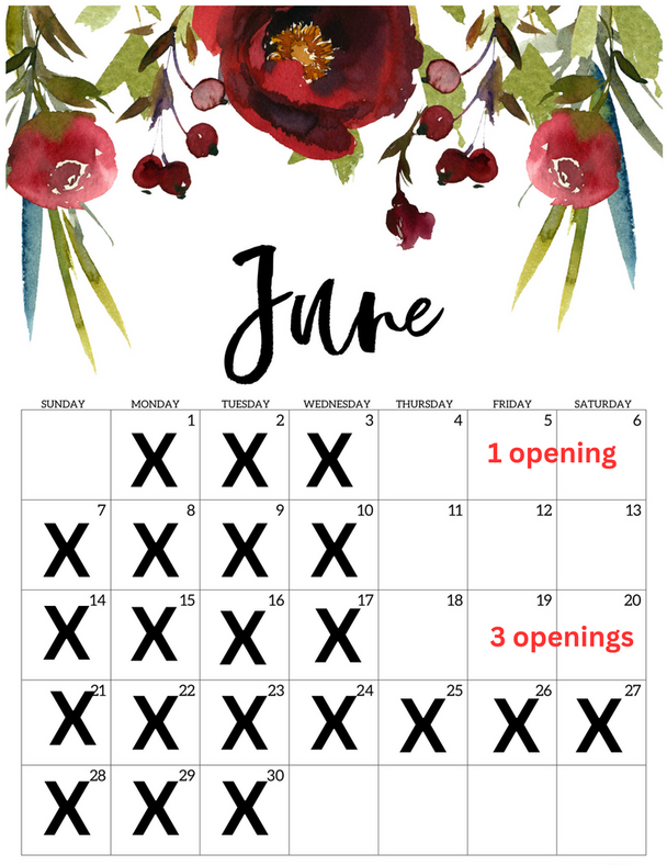 Below are calendars for my availability each month. I update this as orders are booked